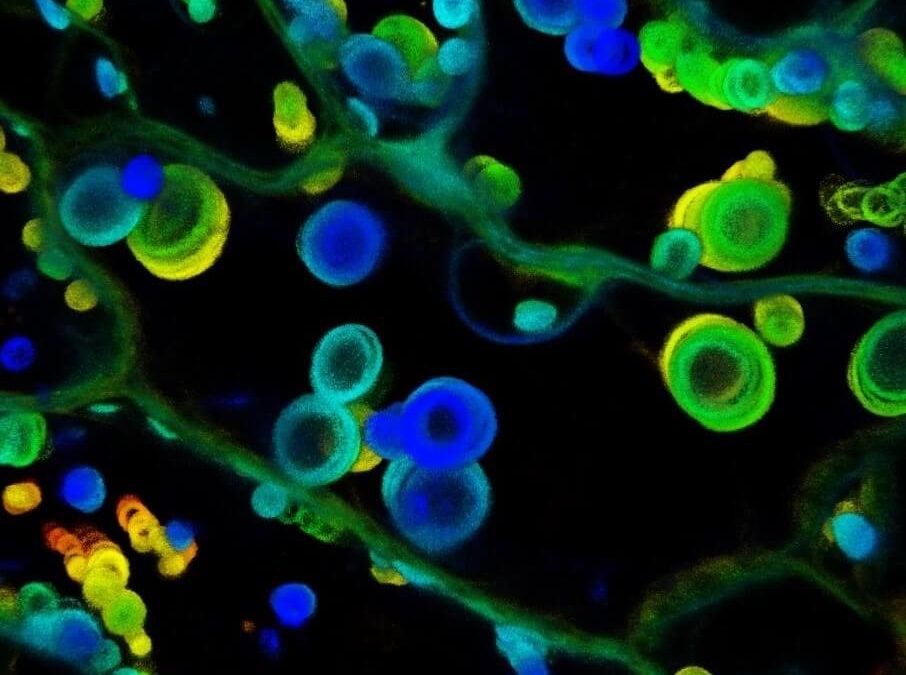 Image d’une cellule végétale observée au microscope confocal. La couleur indique l’accumulation d’un facteur de virulence de champignon dans la plante. par Françoise Descoteaux | Juin 27, 2018