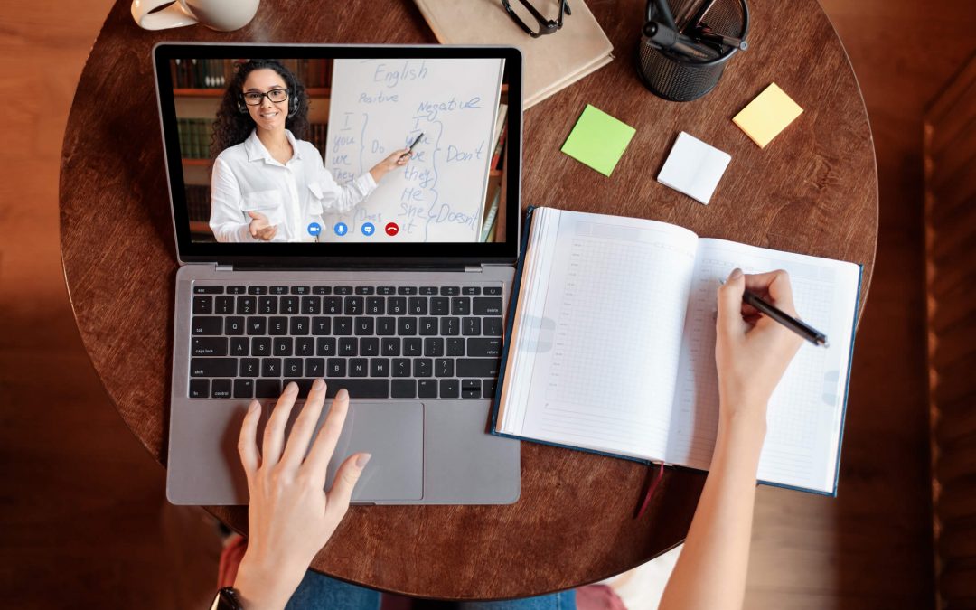 Student using laptop having online class with teacher