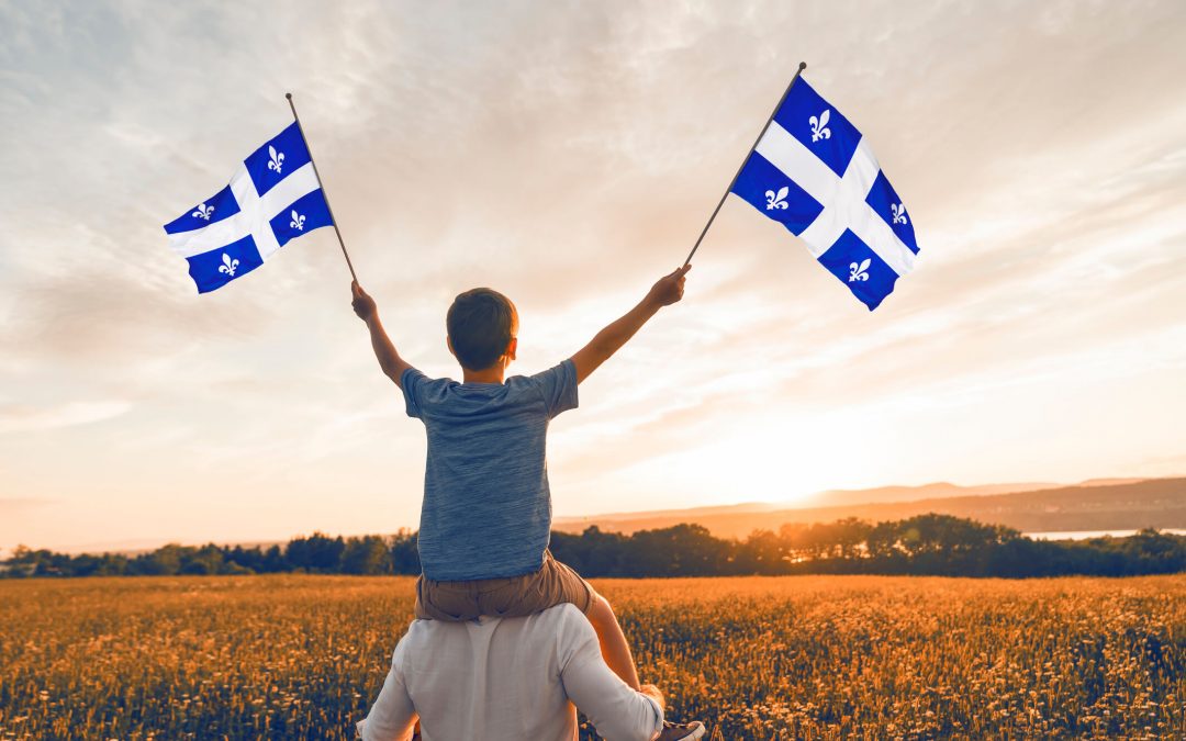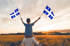 Patriotic father and child waving Quebec flags on sunset
